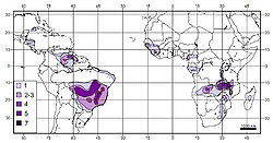 Kaart: verspreiding van de Genlisea soorten. De kleuren geven de soortendichtheid aan. De afbeelding komt uit: Fleischmann et al. 2010. Molecular Phylogenetics and Evolution, 56: 768-783.